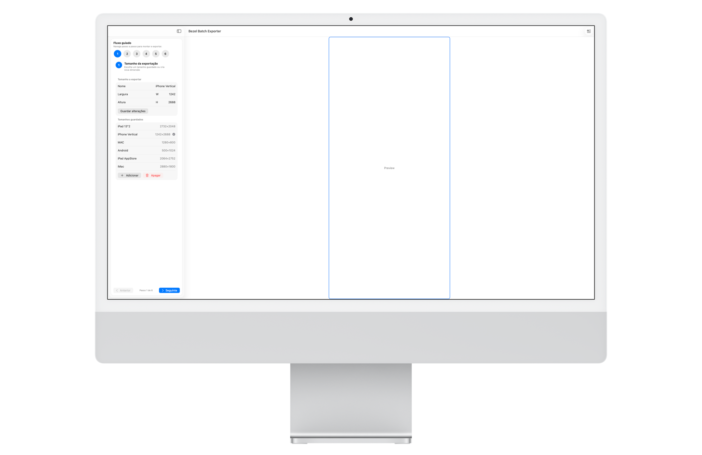Define o tamanho final a exportar. Isto é importante para a aceitação nas lojas de apps. Os tamanhos que usas com frequência podem ficar guardados.