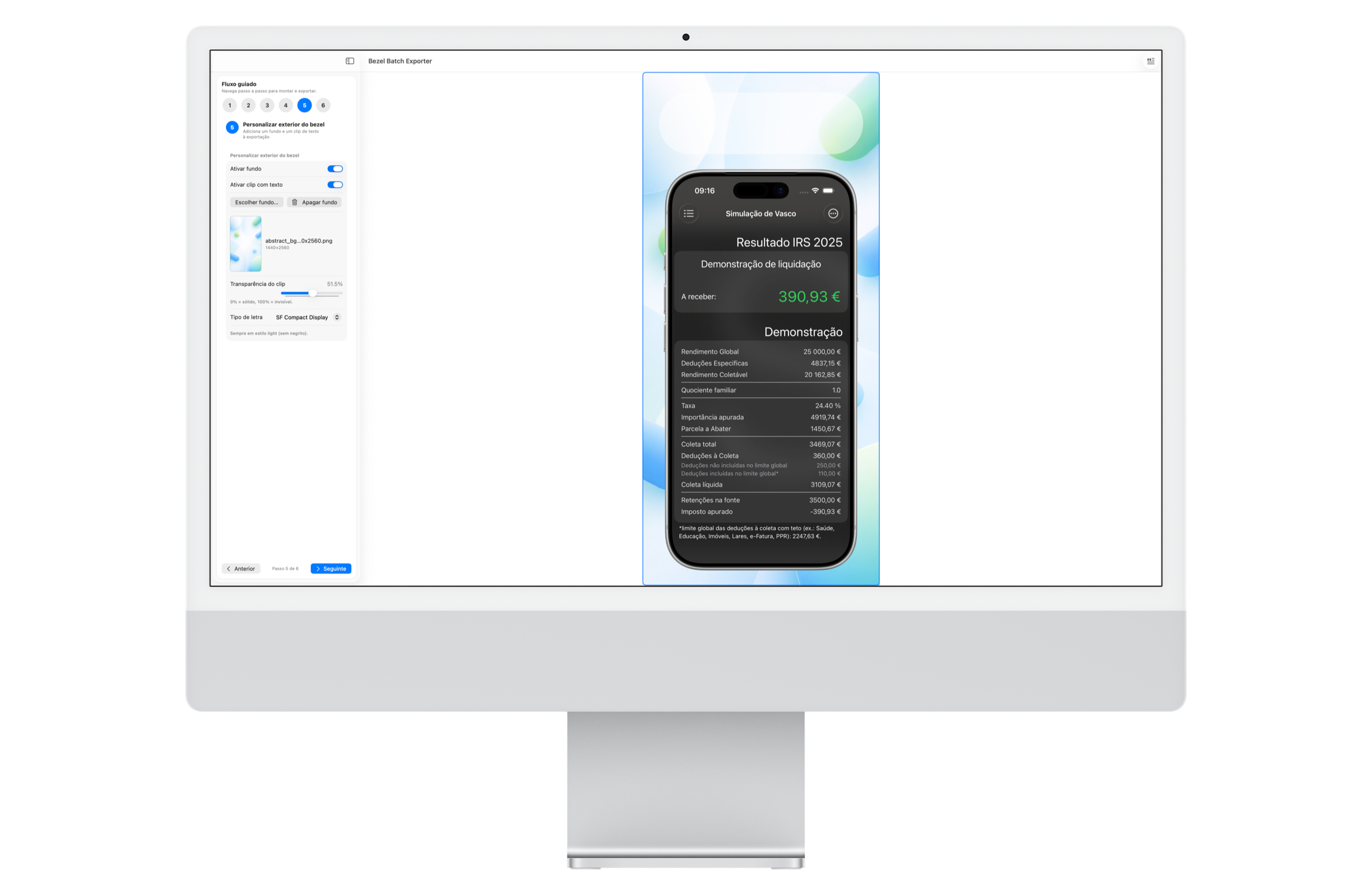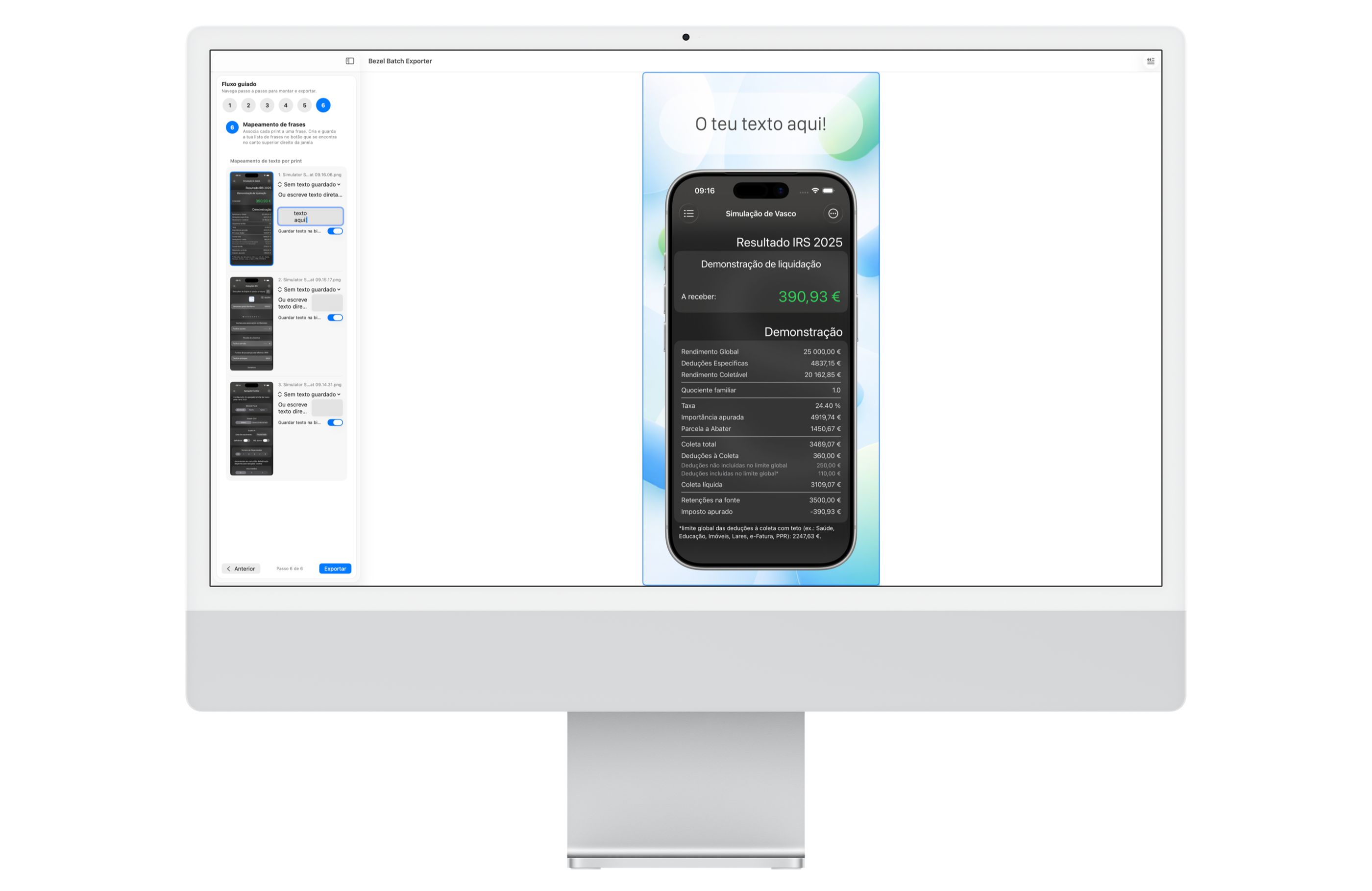 No final, com um só clique, exporta todos os prints, prontos a carregar na tua loja de aplicações.